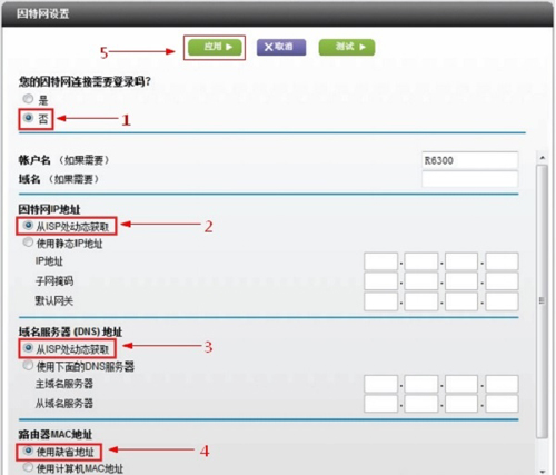 选择菜单“基本”——>“因特网设置”——>“您的因特网连接需要登录吗”选择:否——>“因特网IP地址”选择:从ISP 处动态获取——>“域名服务器(DNS)地址”选择:从ISP处动态获取——>“路由器MAC地址”选择:使用缺省地址——>点击上方“应用”如下图