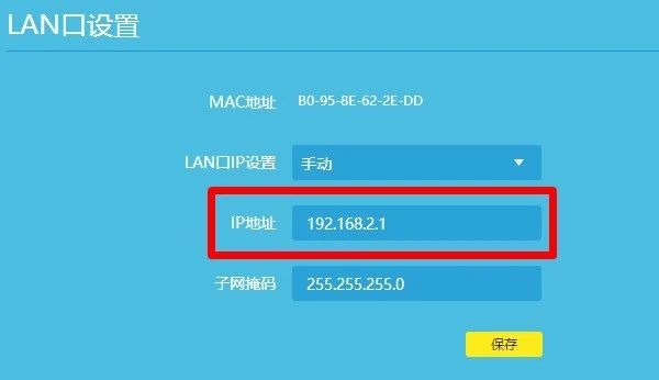 进入路由器,设置界面之后,我们找到路由器的L A N口IP地址,修改成192.168.2.1然后保存之后重启路由器接着在浏览器中打开修改后的IP地址即可重新登陆的路由器界面。